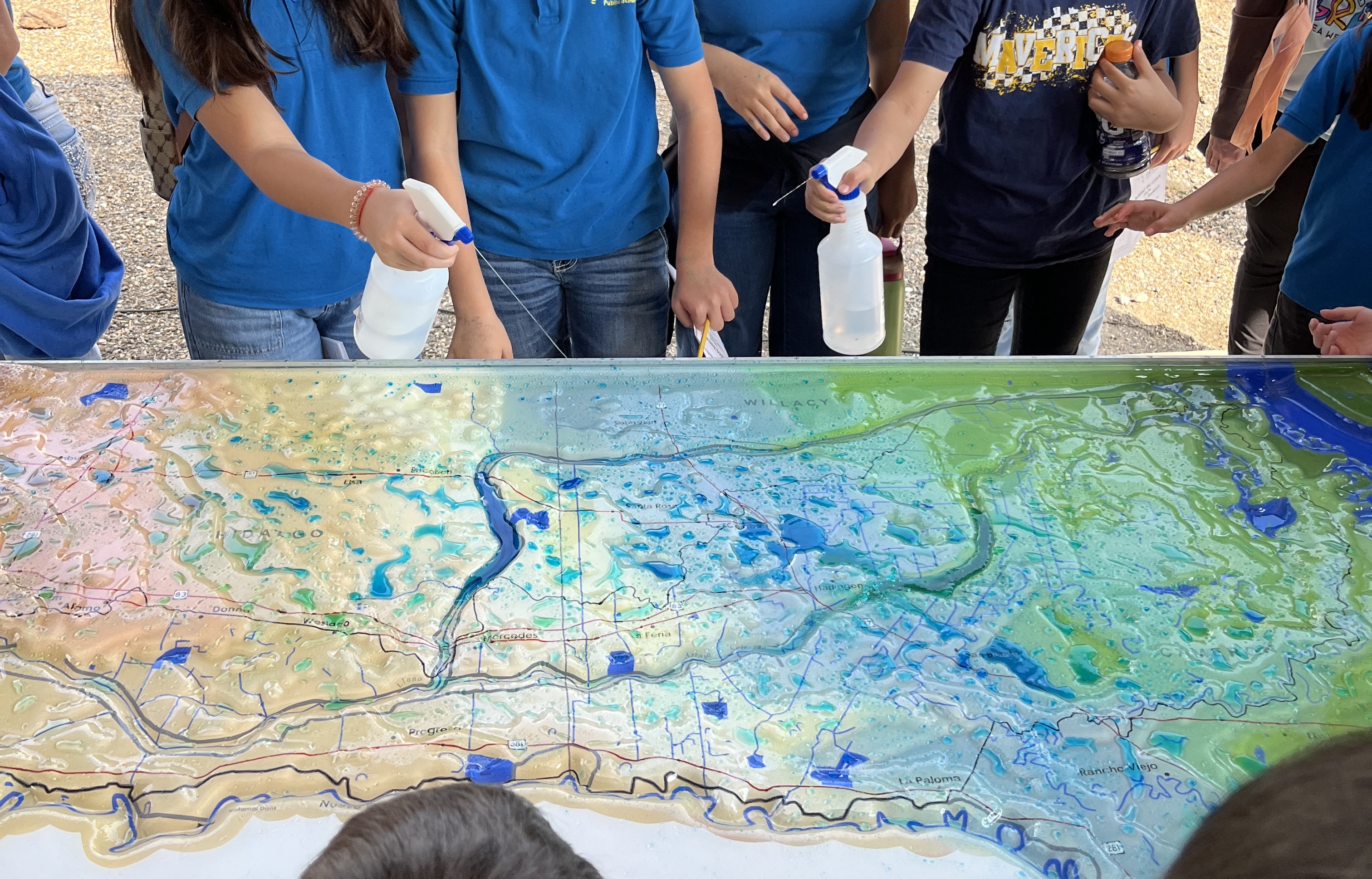 A plastic relief model of the Arroyo Colorado watershed and portions of the South Laguna Madre HUC was built to help educate people about the watershed and the geography of the Cameron, Hidalgo and Willacy Counties. The physical watershed model of the Arroyo Colorado was funded by the Nueces River Authority through the Clean Rivers Program. It is on permanent loan to the Arroyo Colorado Watershed Partnership and is available to all Partners. This 3′ x 7′ model of the Arroyo Colorado is made of tough durable plastic with a metal frame and used to educate people about watershed function and how nonpoint source pollution occurs.